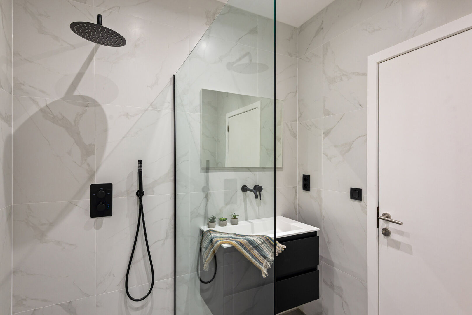 De badkamer is ingericht met een inloopdouche en lavabomeubel.